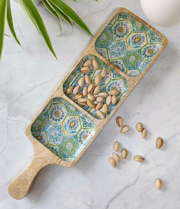 3-part paddle platter, serving platter, appetizer platter, snack platter, dessert platter, party serving dish.