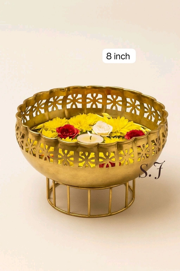 Perfect for traditional rituals, festive occasions, or simply as a statement centerpiece, the Anarkali Urli adds charm and warmth to your living space. Its petite size of 8 inches makes it versatile and easy to place, while the durable metal construction ensures long-lasting beauty.