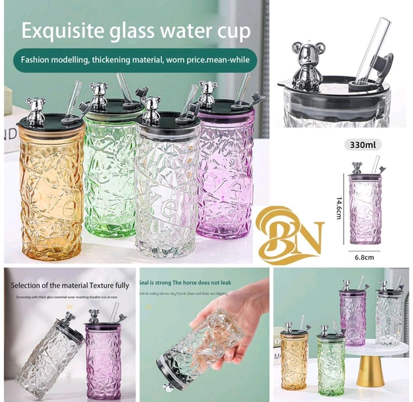 Bear figurine glass sipper/mug/glass with Straw and lid suitable for all your beverages.