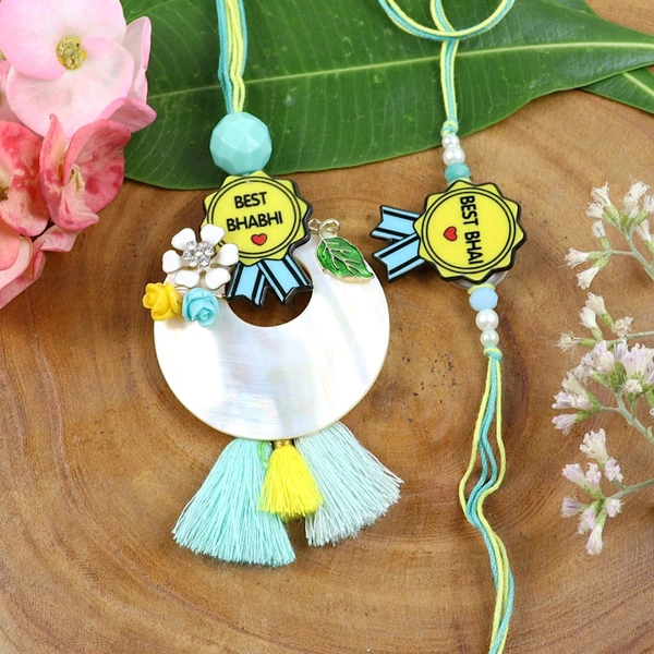 Special rakhi and lumba for your loving bhai and bhabhi jodi designed with mother of pearl finish.