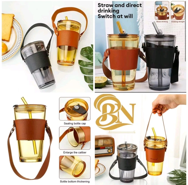 450ml Coffee Mug with Lid & Straw, Glass Tea Cup Set with Lether Sleeve Strap Milk Water Juice Travel Mug Best Gift for Birthday, Anniversary, Office Gifting